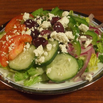 Romaine Lettuce, Red Onion, Tomato, Green Pepper, Calamata (Black) Olive, Feta Cheese, Cucumber.